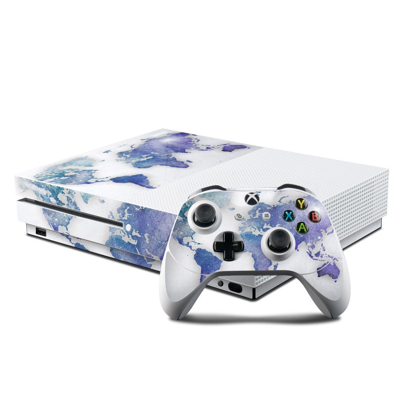 iStyles Xbox One S Skin design of World, Map, Watercolor paint, Illustration, with white, blue, purple colors, and tagged with maps, globe, map, pastel, travel, watercolor, world.