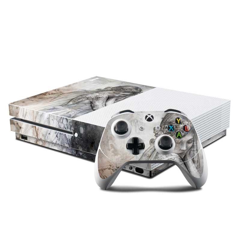 iStyles Xbox One S Skin design of Lady, Art, Illustration, Drawing, Painting, Sketch, Mythology, Figure drawing, Long hair, Visual arts, with white, gray, black colors, and tagged with skulls, people, flowers, fantasy, death, ghost, goth, gothic, scythe, skull, tattoo.
