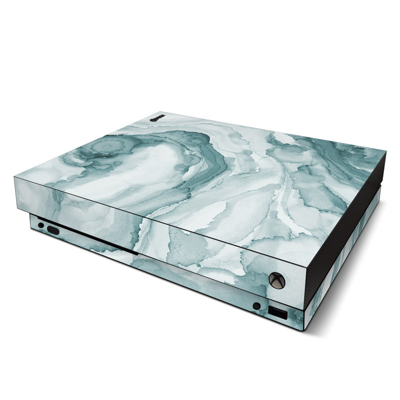 iStyles Xbox One X Skin design of Liquid, Fluid, Snow, Polar ice cap, Ice cap, Aqua, Melting, Glacial landform, Arctic ocean, Pattern, with blue, gray, white colors, and tagged with patterns, abstract, paint, painting, water, watercolor.