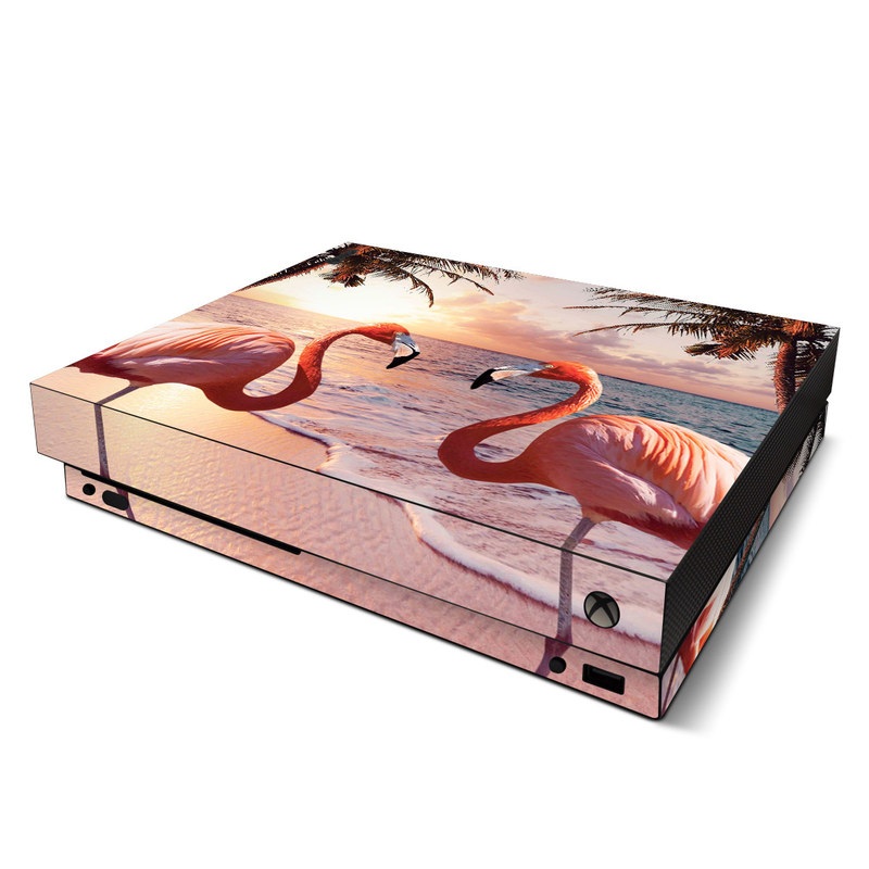 iStyles Xbox One X Skin design of Flamingo, Greater flamingo, Bird, Water bird, Pink, Wildlife, Sky, Tree, Organism, Beak, with pink, blue, green, yellow, white, orange, black colors, and tagged with animals, nature, animal, animals, beach, bird, birds, flamingo, ocean, palm, palmtrees, pink, sunset, tropical, tropics.