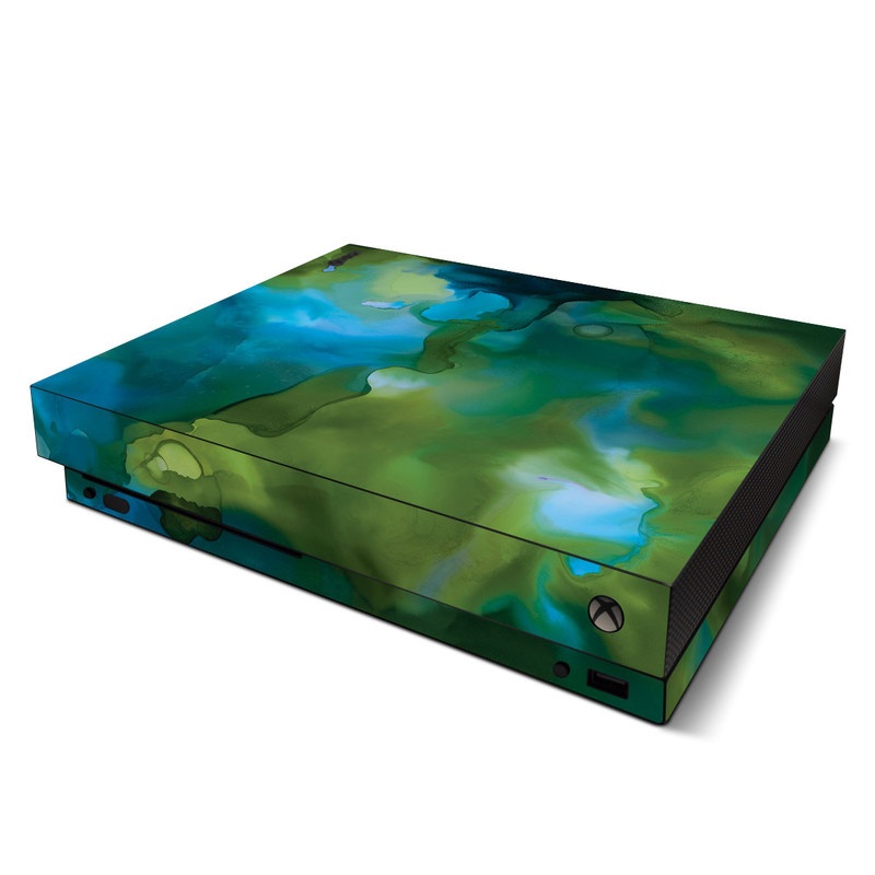 iStyles Xbox One X Skin design of Aqua, Blue, Green, Painting, Turquoise, Teal, Water, Acrylic paint, Art, Organism, with blue, green colors, and tagged with abstract, abstract, blue, green, marble, marbled, watercolor.