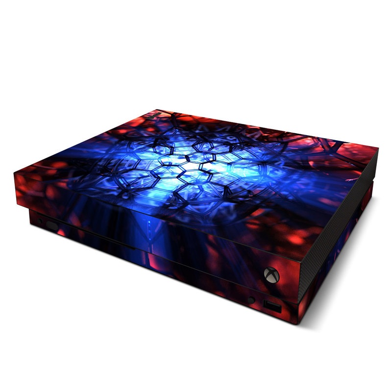 iStyles Xbox One X Skin design of Blue, Fractal art, Red, Light, Pattern, Lighting, Art, Kaleidoscope, Design, Psychedelic art, with black, blue, red colors, and tagged with patterns.