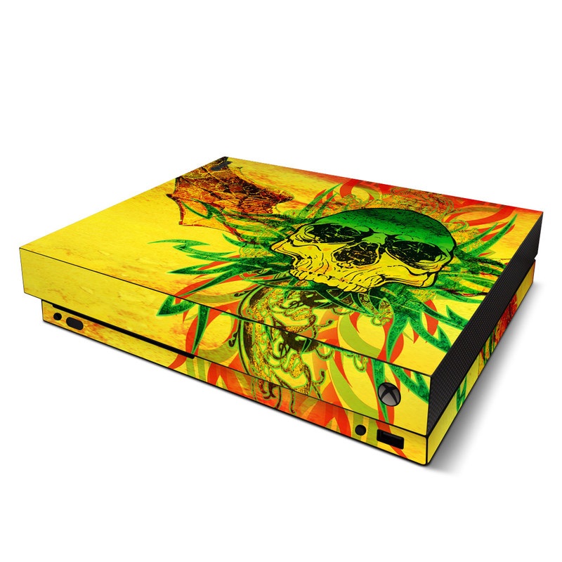 iStyles Xbox One X Skin design of Psychedelic art, Skull, Illustration, Bone, Art, Graphic design, Visual arts, Poster, Plant, Painting, with green, orange, black, red colors, and tagged with skulls.