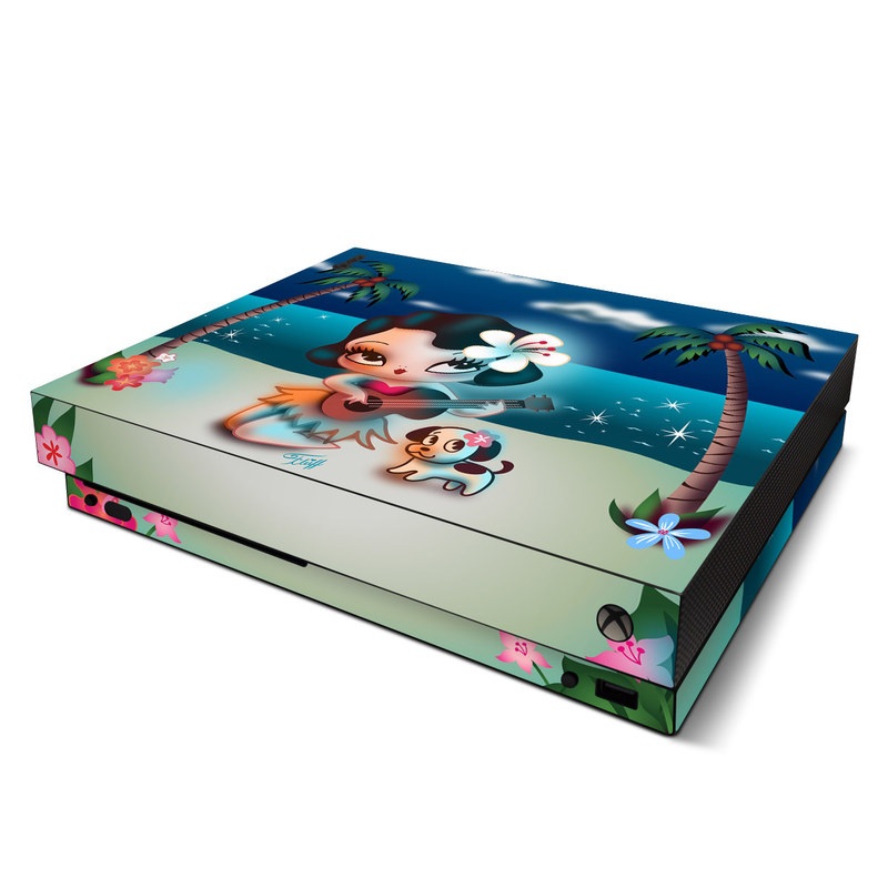iStyles Xbox One X Skin design of Cartoon, Animated cartoon, Illustration, Animation, Fictional character, Plant, Art, Clip art, with blue, white, brown, pink, green, yellow, red colors, and tagged with animals, objects, flowers, nature, people, beach, cartoon, flower, flowers, hawaii, hawaiian, hula, ocean, pinup, pinupgirl, tropic, tropical.
