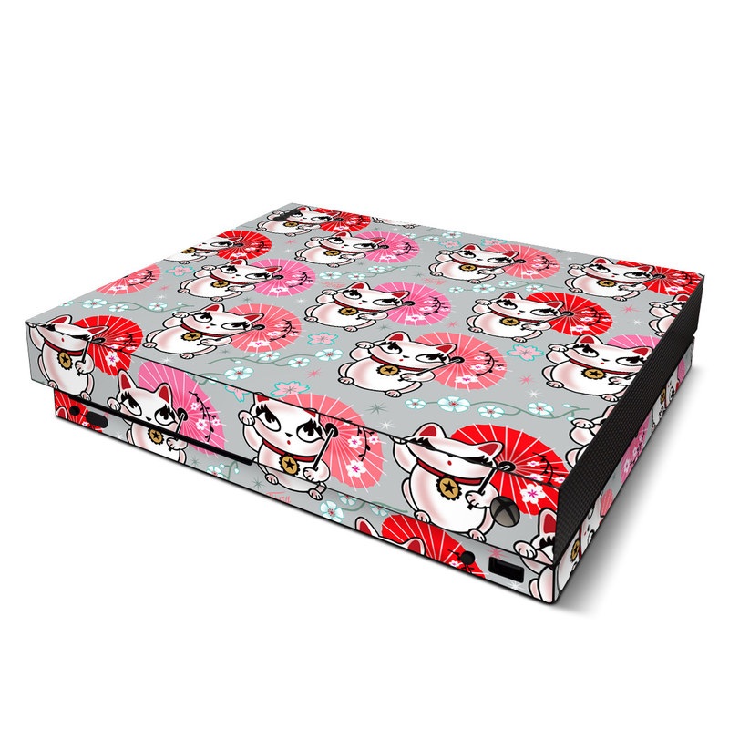 iStyles Xbox One X Skin design of Pink, Red, Cartoon, Design, Line, Textile, Pattern, Illustration, Smile, Fictional character, with white, red, pink, gray, blue, black colors, and tagged with patterns, animals, objects, cat, cats, fantasy, flower, flowers, grey, pink.