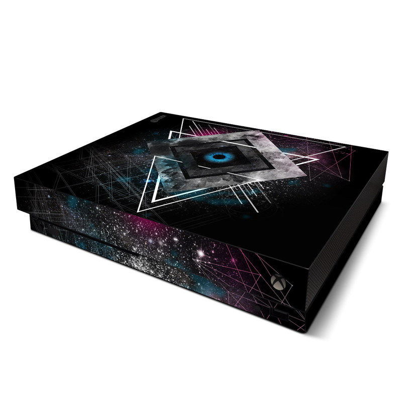 iStyles Xbox One X Skin design of Graphic design, Design, Pattern, Graphics, Illustration, Font, Circle, Triangle, Fractal art, Logo, with black, gray colors, and tagged with abstract, space.