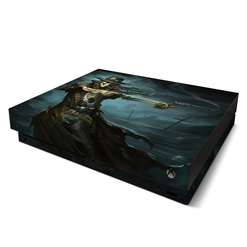 iStyles Xbox One X Skin design of Cg artwork, Action-adventure game, Darkness, Illustration, Games, Adventure game, Pc game, Woman warrior, Digital compositing, Fictional character, with black, white, blue, gray colors, and tagged with fantasy, skulls, people, bullets, fantasy, gaming, guns, skeleton, skull.