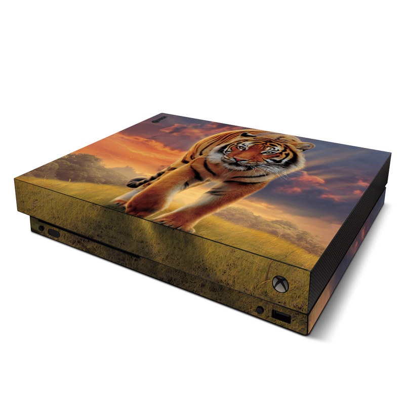 iStyles Xbox One X Skin design of Tiger, Wildlife, Bengal tiger, Mammal, Felidae, Siberian tiger, Sky, Big cats, Terrestrial animal, Carnivore, with black, white, yellow, red, green, blue colors, and tagged with animals, nature, animal, nature, sunrise, sunset, tiger, wildlife.