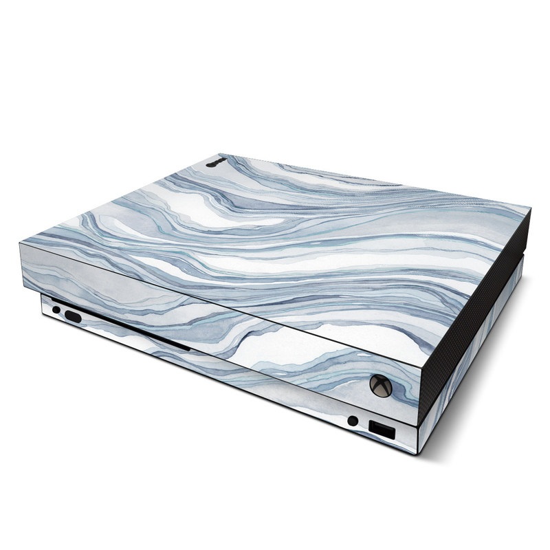 iStyles Xbox One X Skin design of Water, Liquid, Azure, Fluid, Grey, Aqua, Pattern, Wind wave, Electric blue, Wind, with blue, white colors, and tagged with patterns, abstract, blue, draw, indigo, line, lines, paint, painting, purple, watercolor.