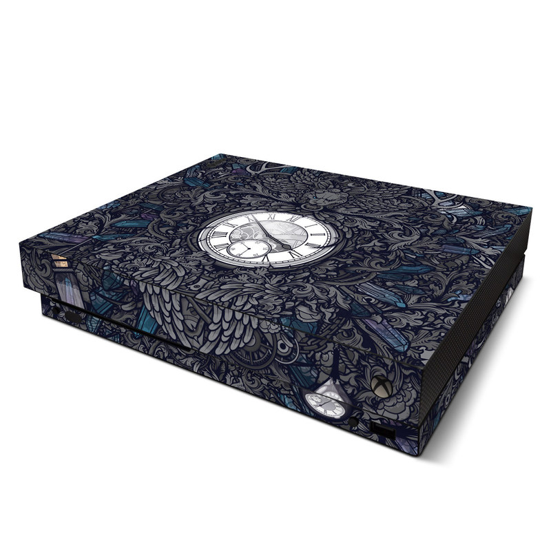 iStyles Xbox One X Skin design of Blue, Pattern, Psychedelic art, Design, Circle, Art, Font, Graphic design, Visual arts, Illustration, with black, gray colors, and tagged with objects, patterns, animals, grandfather, clock, clocks, alarm, time, antique, table.