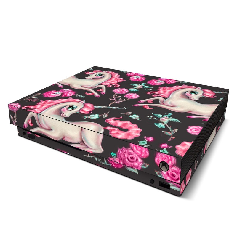 iStyles Xbox One X Skin design of Pink, Horse, Pony, Fictional character, Unicorn, Mythical creature, Mane, Textile, Animal figure, Illustration, with white, pink, blue, black, red colors, and tagged with patterns, animals, flowers, fantasy, flower, flowers, magic, magical, pink, rose, roses, unicorn, unicorns.
