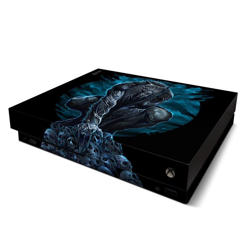 iStyles Xbox One X Skin design of Illustration, Fictional character, Werewolf, Darkness, Art, Mythology, Graphic design, Mythical creature, Cg artwork, with gray, blue, black colors, and tagged with animals, skulls, fantasy.