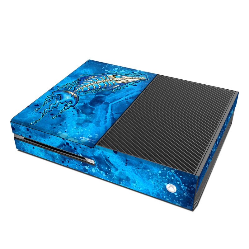 iStyles Xbox One Skin design of Blue, Water, Aqua, Electric blue, Illustration, Graphic design, Liquid, Graphics, Marine biology, Art, with blue, white colors, and tagged with skulls, animals.