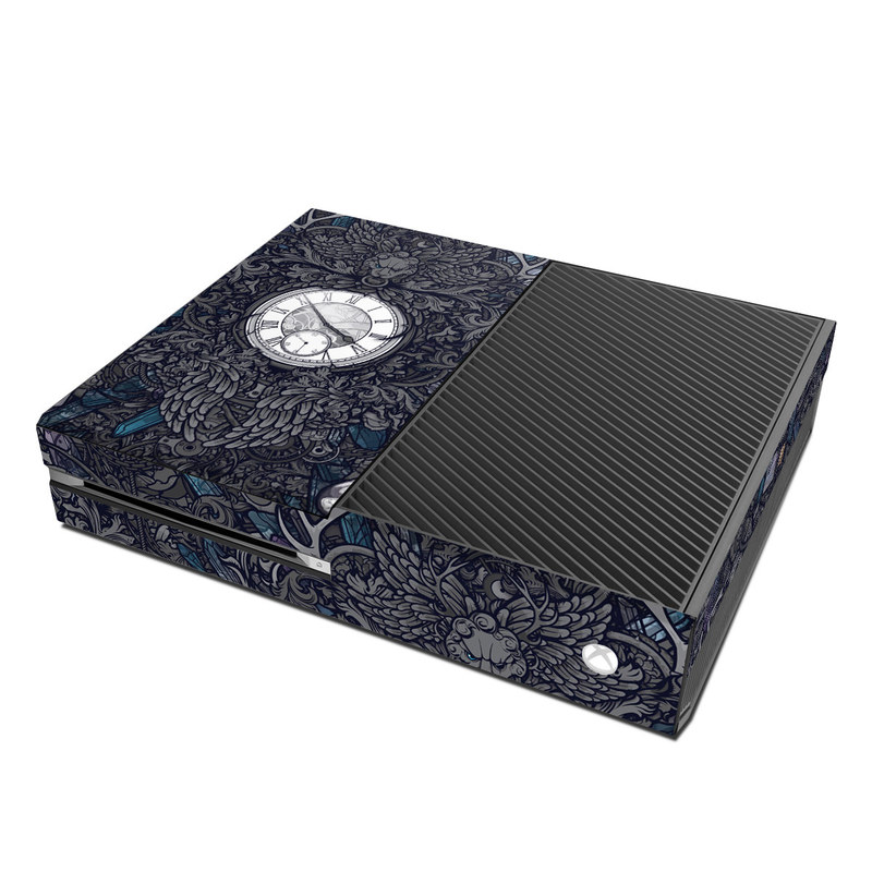 iStyles Xbox One Skin design of Blue, Pattern, Psychedelic art, Design, Circle, Art, Font, Graphic design, Visual arts, Illustration, with black, gray colors, and tagged with objects, patterns, animals, grandfather, clock, clocks, alarm, time, antique, table.