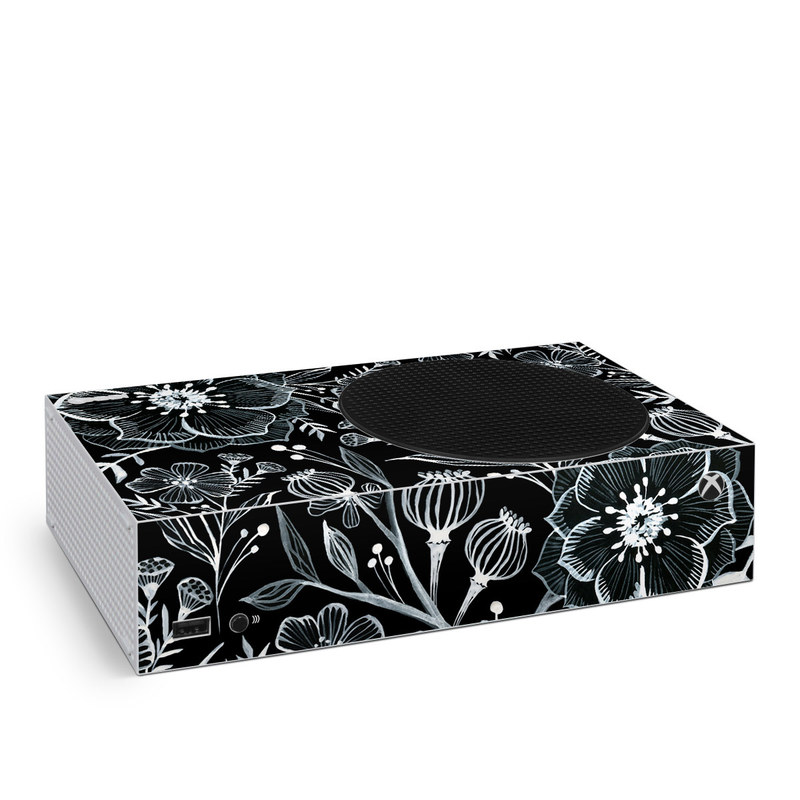 iStyles Xbox Series S Skin design of Pattern, Black-and-white, Flower, Monochrome photography, Plant, Design, Monochrome, Botany, Wildflower, Visual arts, with black, white colors, and tagged with flowers, patterns, blackandwhite, botanical, floral, flowerpattern, flowers.