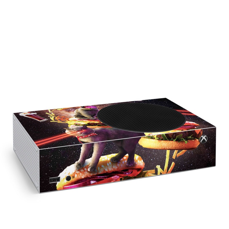 iStyles Xbox Series S Skin design of Circus, Performance, Event, Graphic design, Art, Illustration, Fictional character, with black, white, purple, brown, gray, yellow, green colors, and tagged with animals, fantasy, space, objects, animal, animals, burger, cat, cats, eat, food, galaxy, lasers, space, universe.