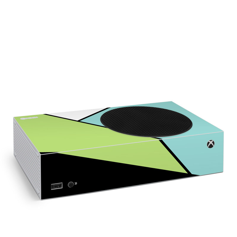 iStyles Xbox Series S Skin design of Green, Line, Blue, Triangle, Design, Parallel, Pattern, Graphic design, Slope, with white, black, green, blue colors, and tagged with patterns, block, blocking, color, colorblock, geometric, shape, simple.