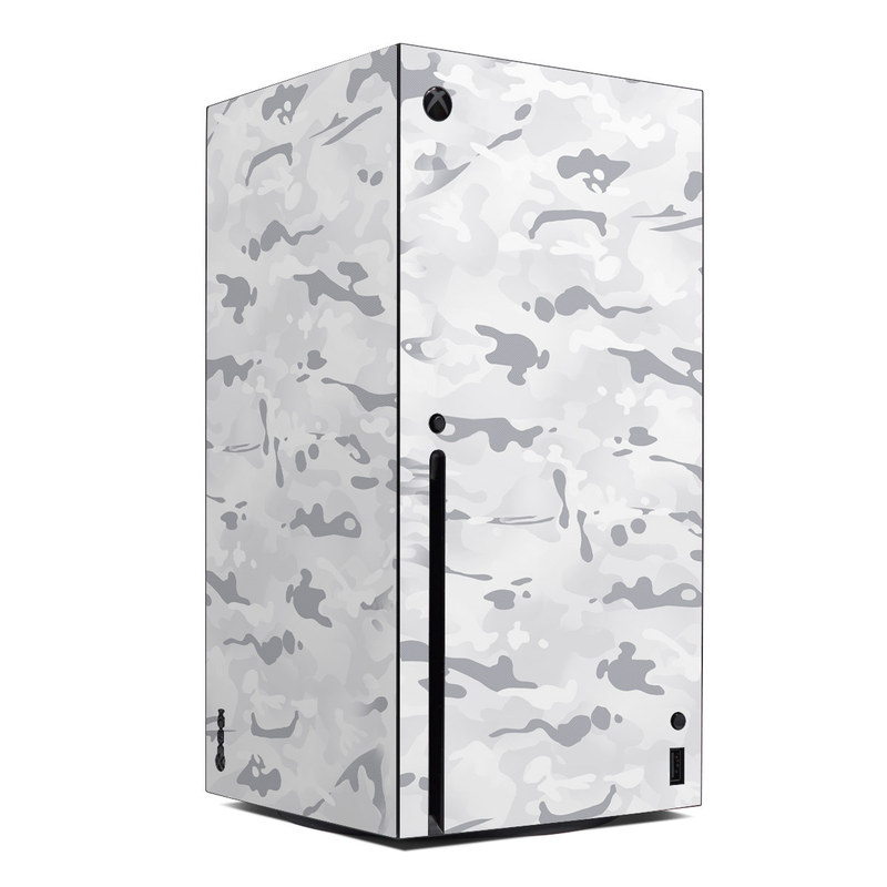 iStyles Xbox Series X Skin design of Vertebrate, Mammal, Grey, Pattern, Monochrome, Art, Monochrome photography, Rock, Font, Winter, with white, gray colors, and tagged with military, patterns, snow, camouflage, mountain, white.