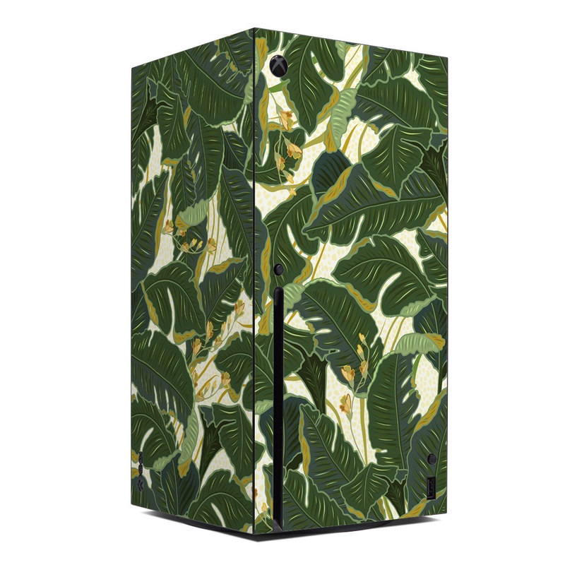 iStyles Xbox Series X Skin design of Leaf, Plant, Flower, Pattern, Botany, Tree, Design, Flowering plant, Arrowroot family, Terrestrial plant, with green, yellow colors, and tagged with patterns, flowers, nature, filigree, floral, leaves, palmleaves, palms, pattern.