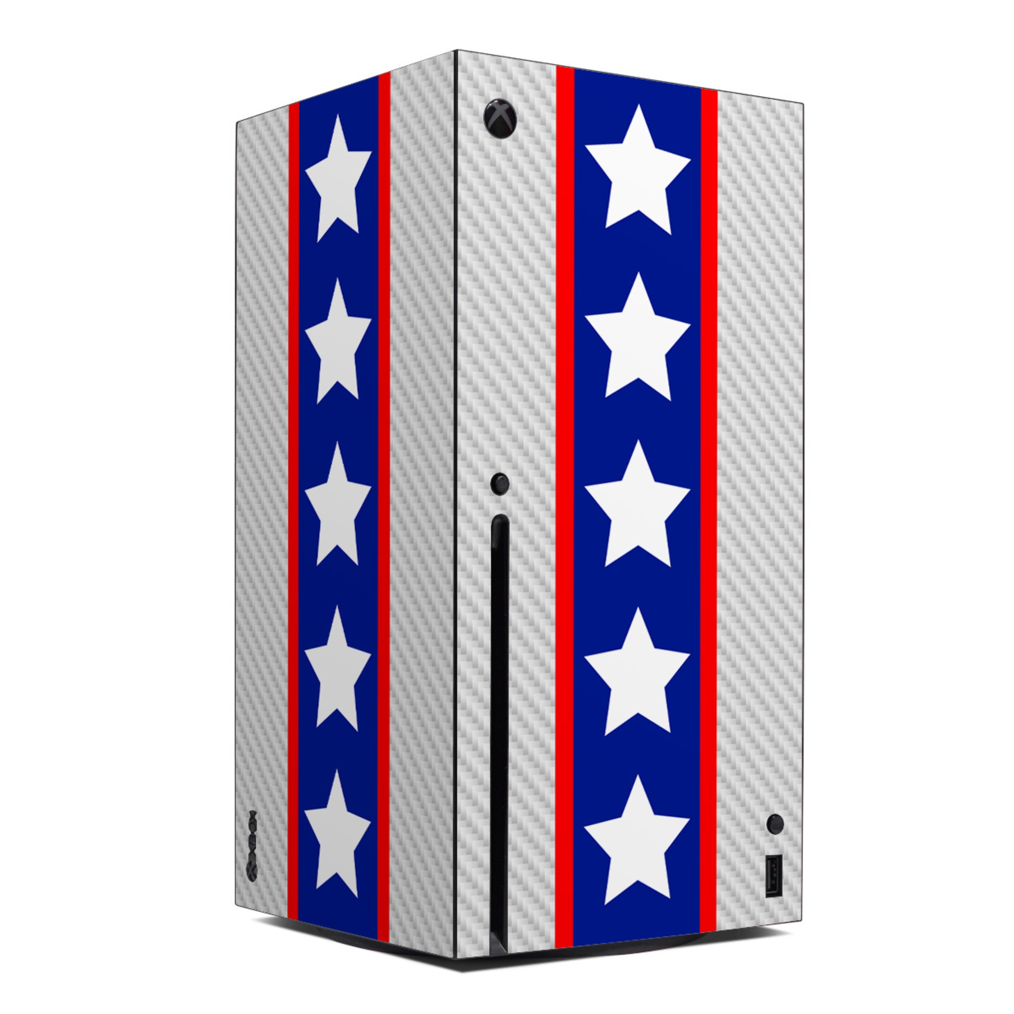 iStyles Xbox Series X Skin design of Flag of the united states, Flag, Font, Parallel, Electric blue, Rectangle, Pattern, Flag Day (USA), Symbol, Carmine, with gray, white, blue, red colors, and tagged with patterns, lookslike, stars, stripes, car.