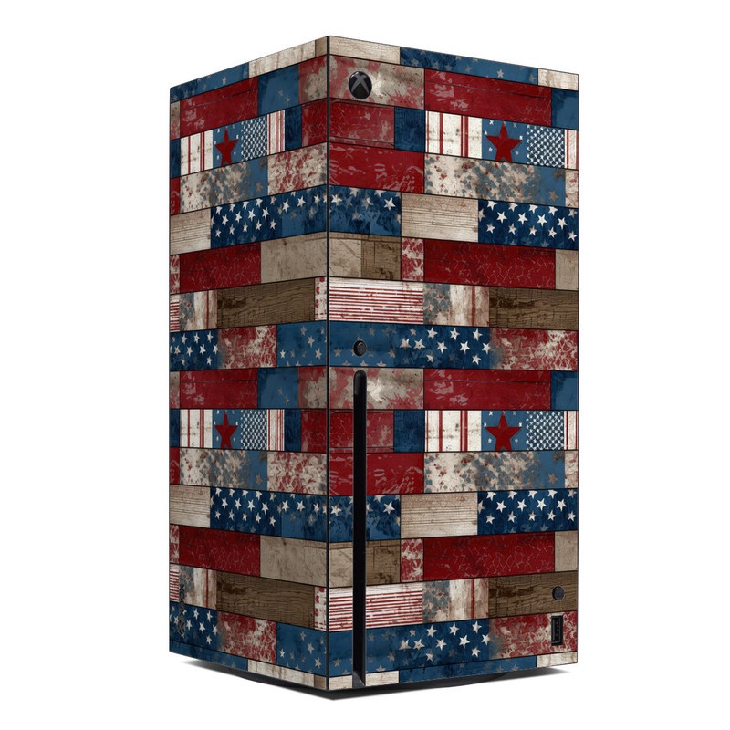 iStyles Xbox Series X Skin design of Photograph, White, Blue, Rectangle, Azure, Textile, Creative arts, Red, Line, Art, with red, blue, white, brown, gray, black colors, and tagged with flags, patterns, signs, united, states, flag, wooden, panels, mosaic, worn.