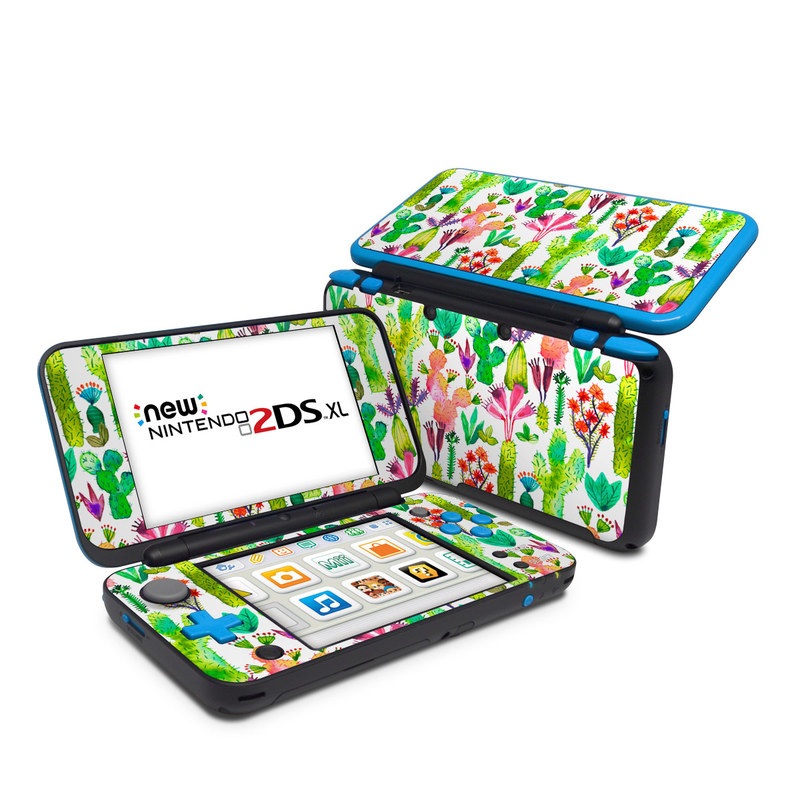 iStyles Nintendo 2DS XL Skin design of Pattern, Floral design, Plant, Wildflower, Wrapping paper, with white, green, red, purple, pink, black colors, and tagged with patterns, nature, flowers, abstract, abstract, bright, cactus, colorful, nature, plants, watercolor.