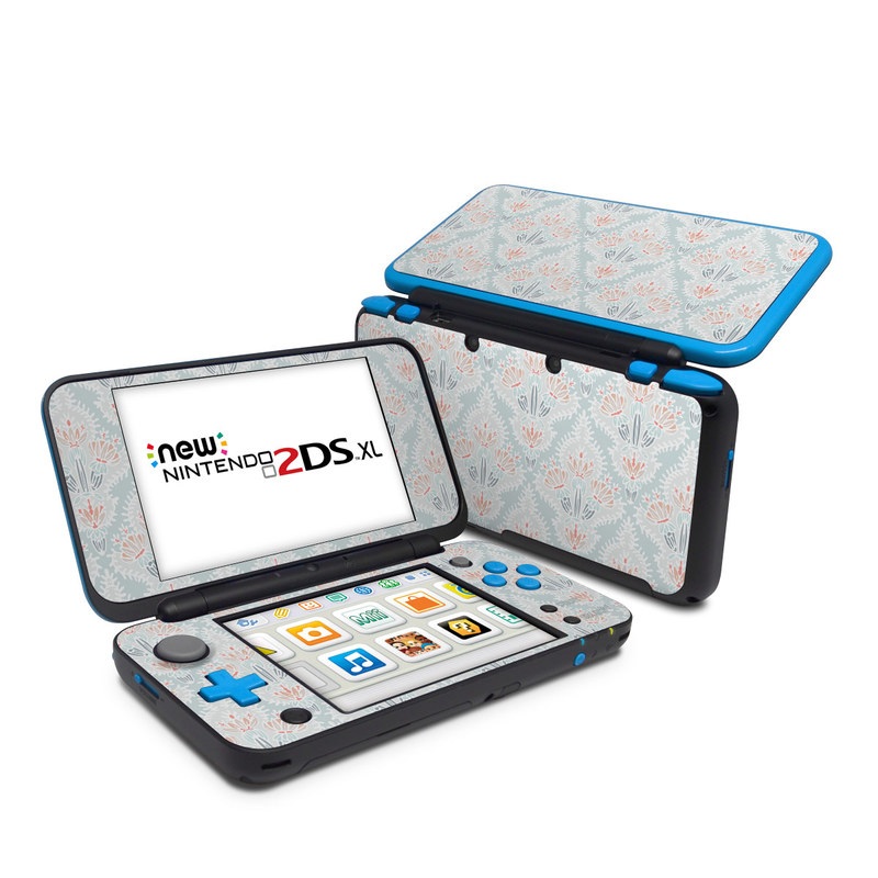iStyles Nintendo 2DS XL Skin design of Pattern, Aqua, Line, Design, Textile, Wrapping paper, Pedicel, Dahlia, Visual arts, with blue, red, white colors, and tagged with patterns, flowers, cactus, floral, flowers, pattern, soft.