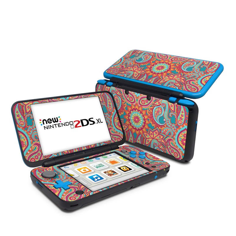 iStyles Nintendo 2DS XL Skin design of Pattern, Paisley, Motif, Visual arts, Design, Art, Textile, Psychedelic art, with orange, yellow, blue, red colors, and tagged with patterns, flowers.