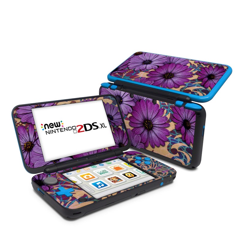 iStyles Nintendo 2DS XL Skin design of Purple, Flower, Violet, Petal, Plant, african daisy, Floral design, Wildflower, Pattern, Textile, with purple, black, gray, blue, green, red colors, and tagged with flowers, patterns.