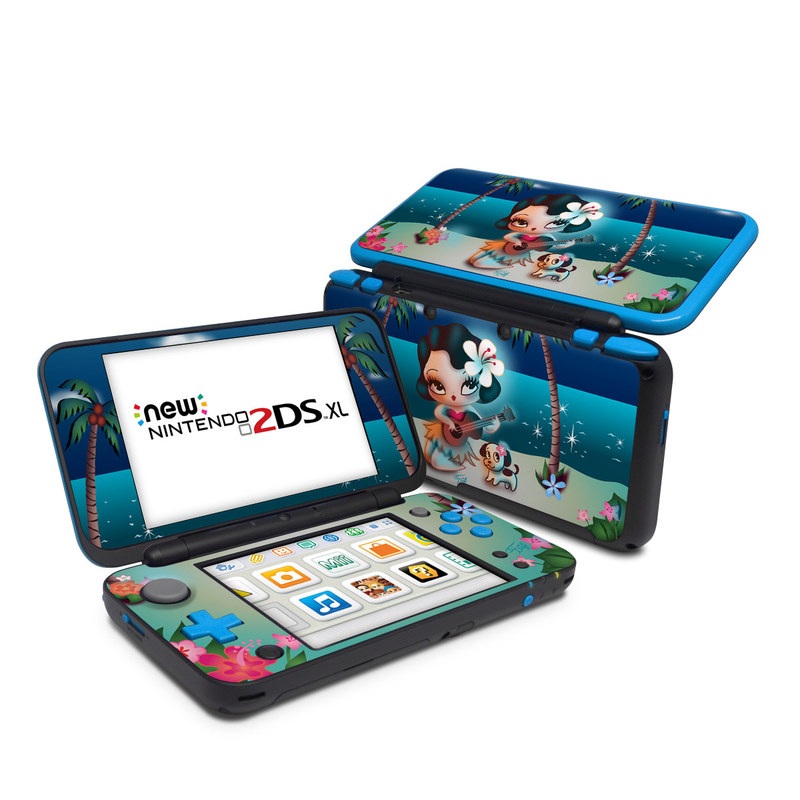 iStyles Nintendo 2DS XL Skin design of Cartoon, Animated cartoon, Illustration, Animation, Fictional character, Plant, Art, Clip art, with blue, white, brown, pink, green, yellow, red colors, and tagged with animals, objects, flowers, nature, people, beach, cartoon, flower, flowers, hawaii, hawaiian, hula, ocean, pinup, pinupgirl, tropic, tropical.