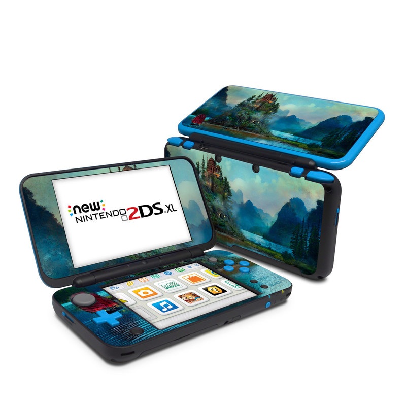 iStyles Nintendo 2DS XL Skin design of Nature, Natural landscape, Sky, Painting, Landscape, Illustration, Watercolor paint, Art, Calm, Water castle, with black, gray, blue, green colors, and tagged with fineart, objects, fantasy, nature, urban.