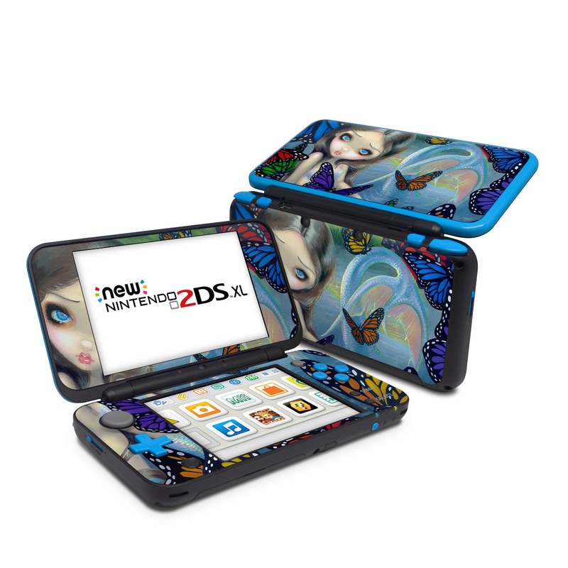 iStyles Nintendo 2DS XL Skin design of Butterfly, Insect, Monarch butterfly, Moths and butterflies, Cynthia (subgenus), Invertebrate, Pollinator, Brush-footed butterfly, Organism, Art, with gray, black, blue, red, pink colors, and tagged with people, animals, nature.