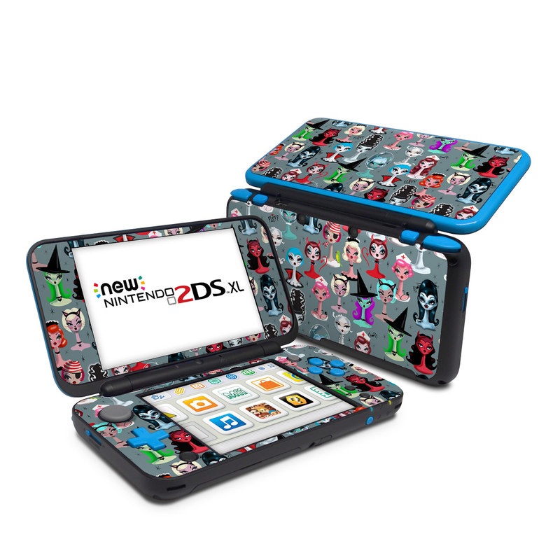 iStyles Nintendo 2DS XL Skin design of Facial expression, Head, Design, Collection, Fictional character, Pattern, Skull, Illustration, Collage, Style, with gray, white, red, blue, green, black, pink, purple colors, and tagged with people, fantasy, objects, costume, halloween, horror, pinup, pinupgirl.