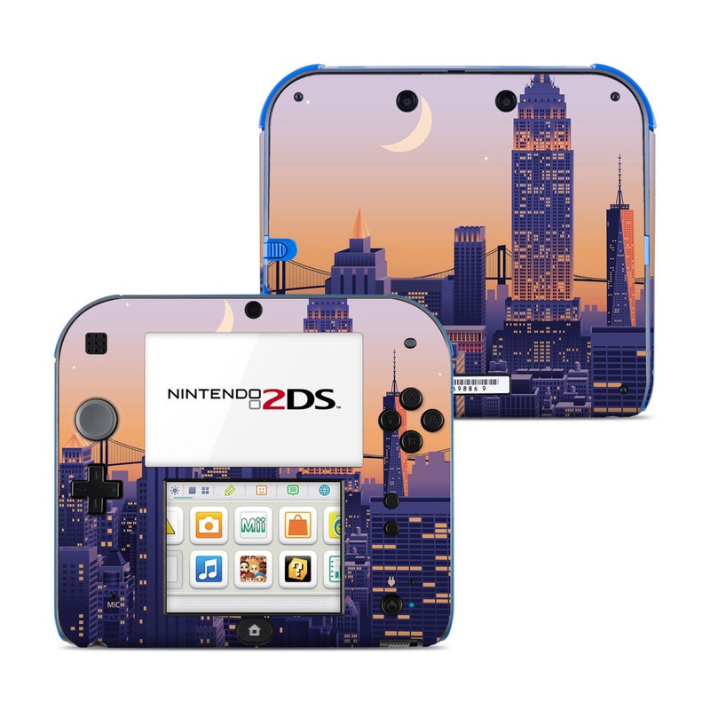 iStyles Nintendo 2DS Skin design of Skyscraper, Building, Sky, Atmosphere, Moon, World, Nature, Tower, Afterglow, Dusk, with blue, purple, yellow, orange colors, and tagged with urban, space, empire, state, building, new, york, skyline, brooklyn, bridge, moon, stars.