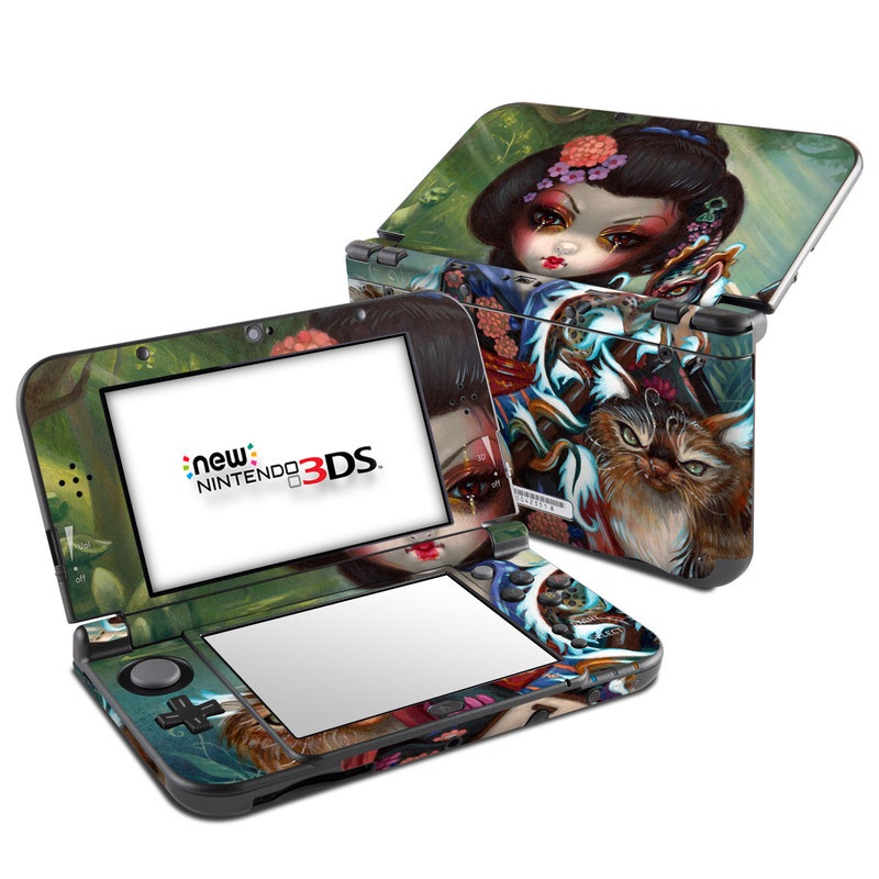 iStyles Nintendo 3DS LL Skin design of Cat, Felidae, Whiskers, Illustration, Art, Small to medium-sized cats, Doll, Kitten, Norwegian forest cat, Fawn, with black, white, red, brown, blue, green, pink, purple colors, and tagged with people, animals, flowers, nature, objects, fantasy, animals, cats, fantasy, kimono.