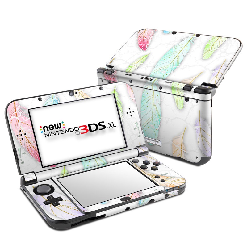 iStyles Nintendo 3DS XL Skin design of Feather, Fashion accessory, Jewellery, with red, blue, green, purple, white, brown colors, and tagged with patterns, objects, aztec, color, feather, feathers, marble, pastel, watercolor.