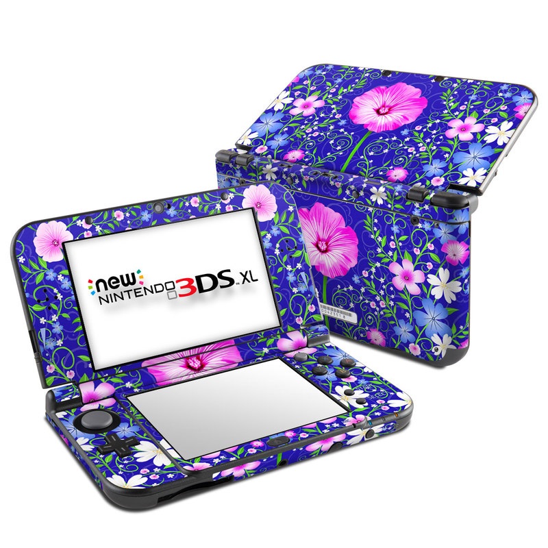 iStyles Nintendo 3DS XL Skin design of Purple, Violet, Flower, Plant, Wildflower, Pattern, Petal, Design, Graphics, Morning glory, with blue, purple, pink, green, white, yellow colors, and tagged with flowers, patterns, floral, flowers, nature.