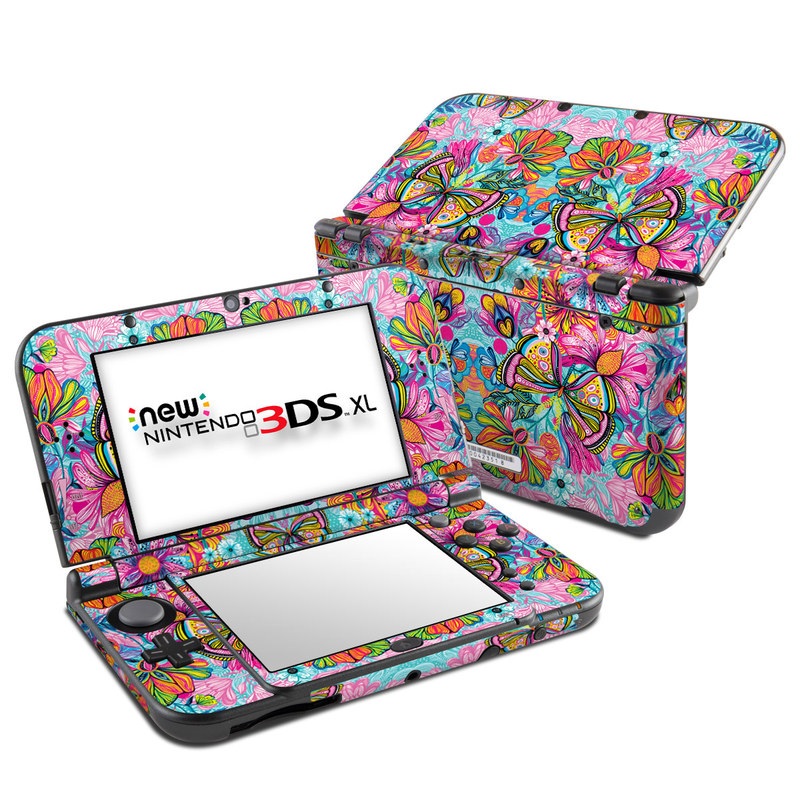 iStyles Nintendo 3DS XL Skin design of Pattern, Design, Textile, Psychedelic art, Visual arts, Symmetry, Art, Motif, with blue, pink, green, yellow, orange, purple colors, and tagged with patterns, flowers, animals, bright, butterfly, carpintos, colorful, flowers, pastels, pattern, spring, summer.