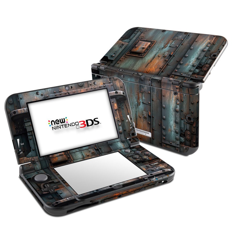 iStyles Nintendo 3DS XL Skin design of Wood, Train, Wheel, Motor vehicle, Mode of transport, Rolling, Automotive lighting, Rolling stock, freight car, Gas, with black, brown, gray, white, orange colors, and tagged with lookslike, objects, safe, vault, bank, steel, rust.