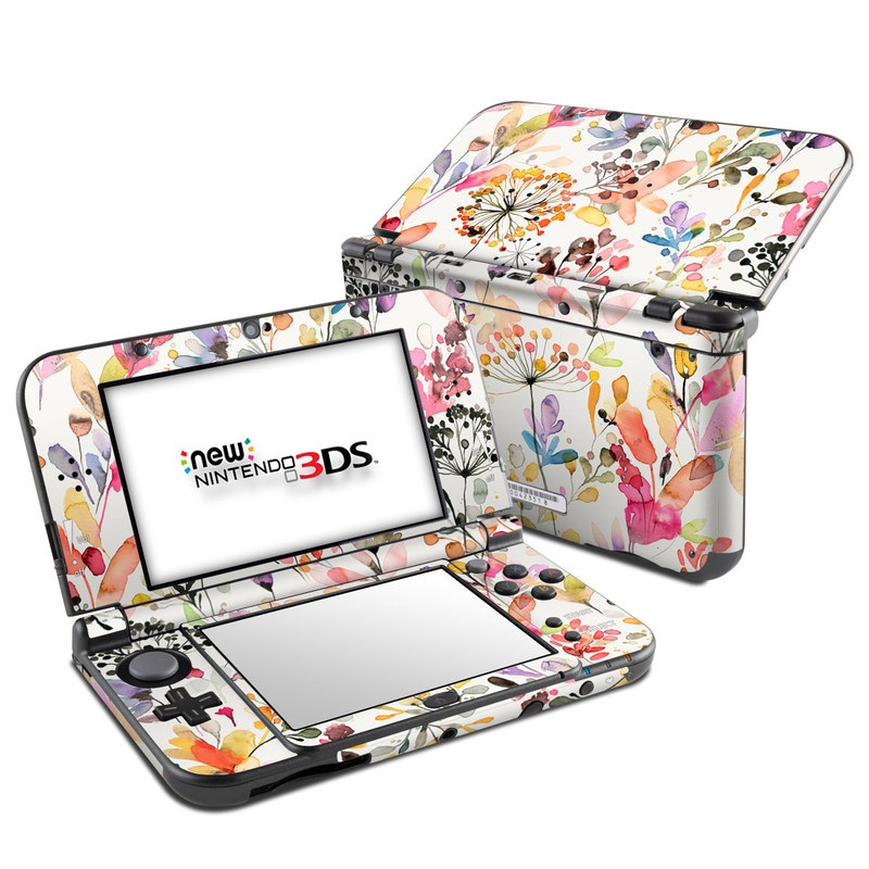 iStyles Nintendo 3DS XL Skin design of Flower, Petal, Rectangle, Branch, Creative arts, Plant, Line, Art, Painting, Font, with white, pink, red, yellow, orange, green, blue, purple colors, and tagged with patterns, flowers, nature, flower, flowers, garden, grass, nature, outdoors, watercolor.
