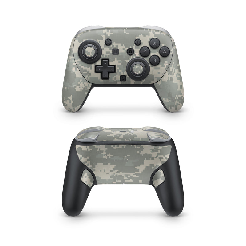 iStyles Nintendo Switch 2 Pro Controller Skin design of Military camouflage, Green, Pattern, Uniform, Camouflage, Design, Wallpaper, with gray, green colors, and tagged with military, lookslike, patterns.