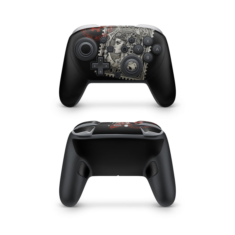 iStyles Nintendo Switch 2 Pro Controller Skin design of Font, Postage stamp, Illustration, Drawing, Art, with black, gray, red colors, and tagged with people, objects, signs.