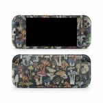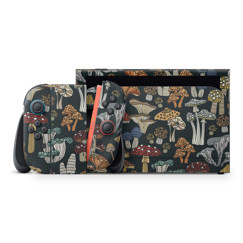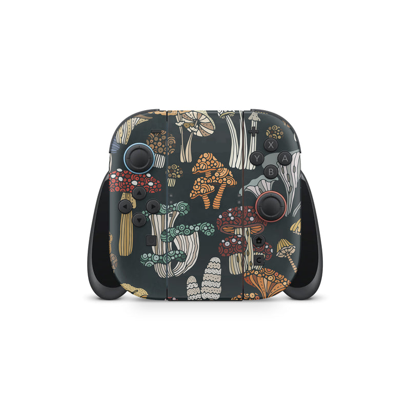 iStyles Nintendo Switch 2 Skin design of Brown, Textile, Sleeve, Art, Font, Pattern, Collage, Painting, Illustration, Event, with black, white, blue, red, yellow, orange colors, and tagged with patterns, objects, fungi, mushrooms, pattern.