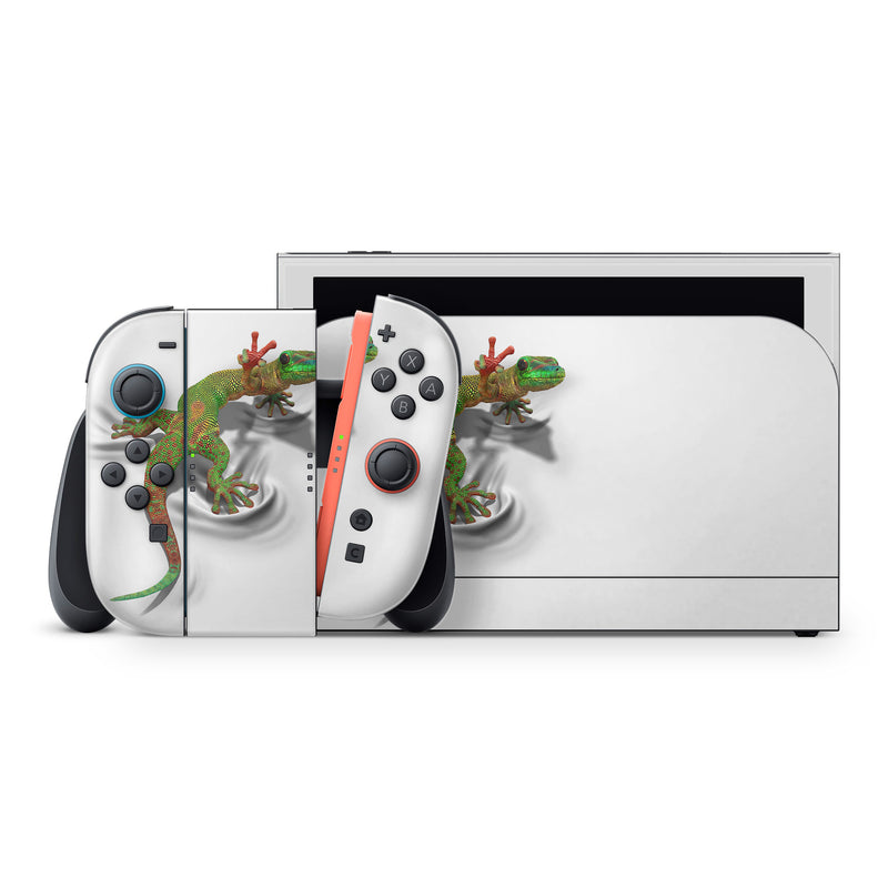 iStyles Nintendo Switch 2 Skin design of Lizard, Reptile, Gecko, Scaled reptile, Green, Iguania, Animal figure, Wall lizard, Fictional character, Iguanidae, with white, gray, black, red, green colors, and tagged with animals.