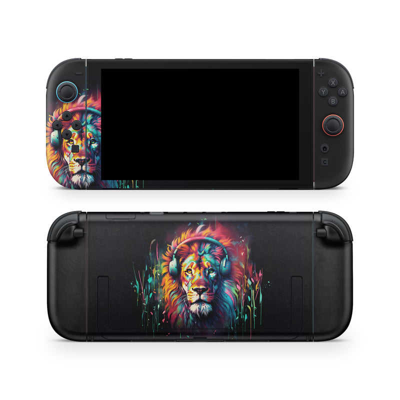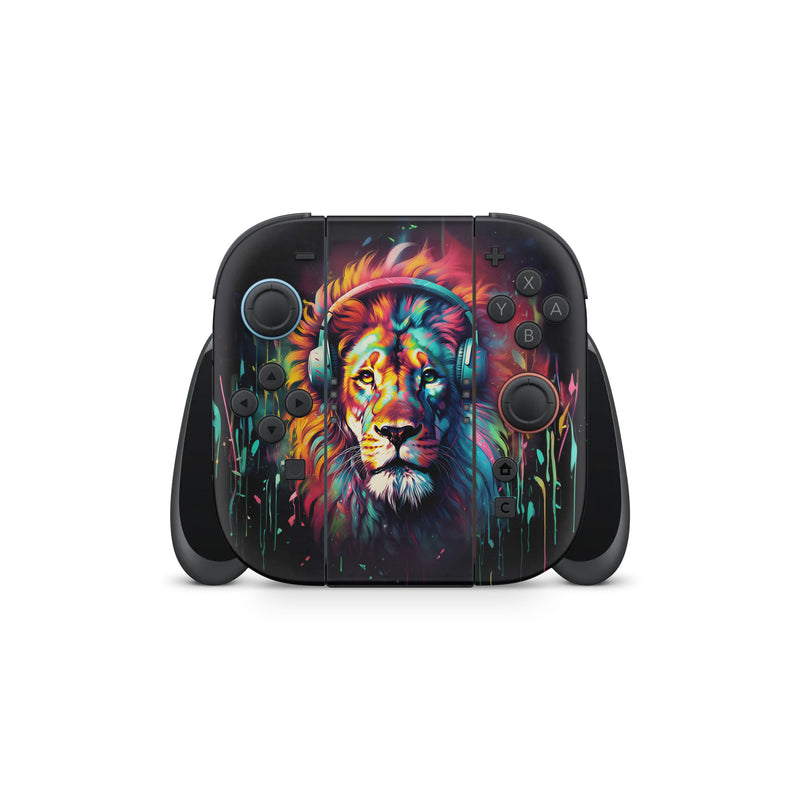 iStyles Nintendo Switch 2 Skin design of Felidae, Siberian tiger, Bengal tiger, Carnivore, Big cats, Tiger, Painting, Art, Font, Paint, with black, red, yellow, orange, green, blue, pink colors, and tagged with animals, fantasy, objects, lion, headphones.