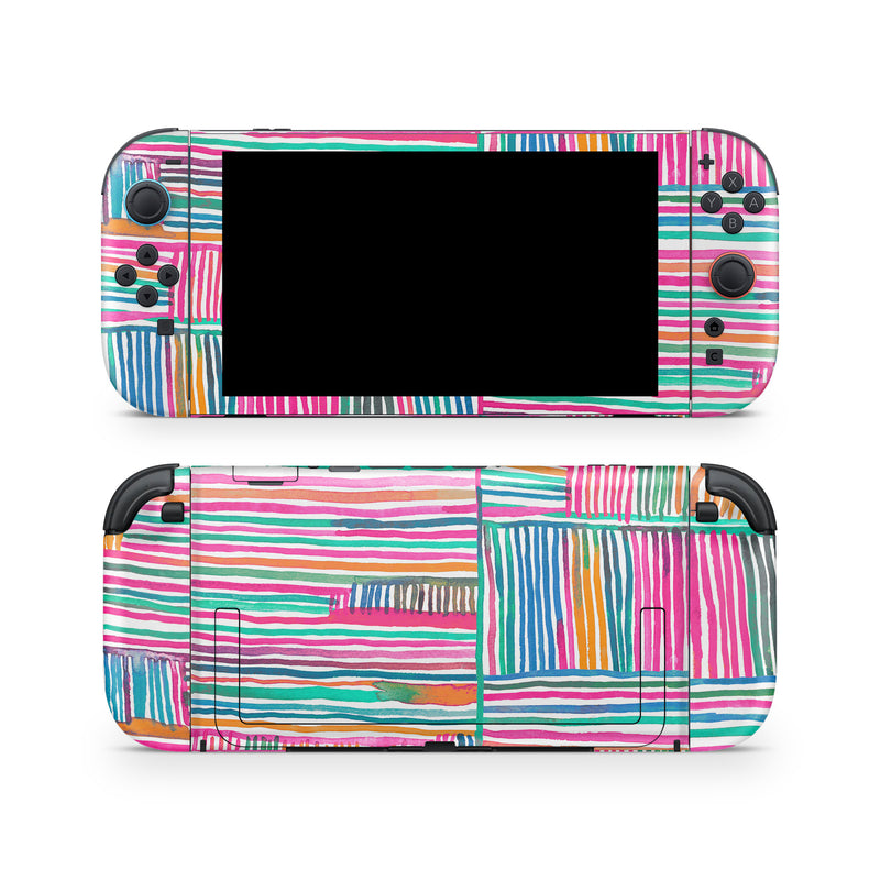 iStyles Nintendo Switch 2 Skin design of Colorfulness, Product, Rectangle, Azure, Textile, Art, Aqua, Material property, Magenta, Tints and shades, with white, pink, orange, green, blue, yellow colors, and tagged with patterns, stripes, pattern.