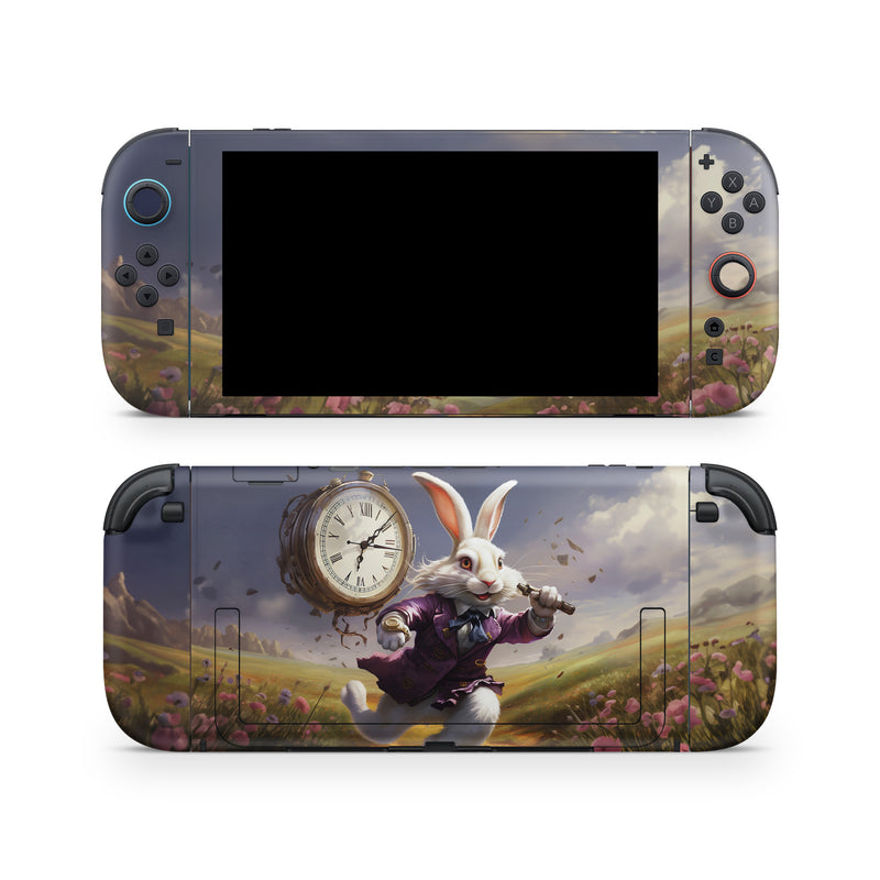 iStyles Nintendo Switch 2 Skin design of Sky, Plant, Nature, Cartoon, Rabbit, Cloud, Clock, Happy, Fawn, Art, with white, gray, purple, blue, green, pink, brown colors, and tagged with fantasy, objects, animals, alice, wonderland, rabbit, clock.