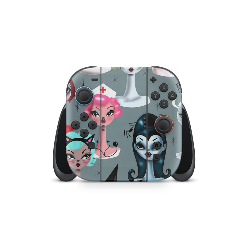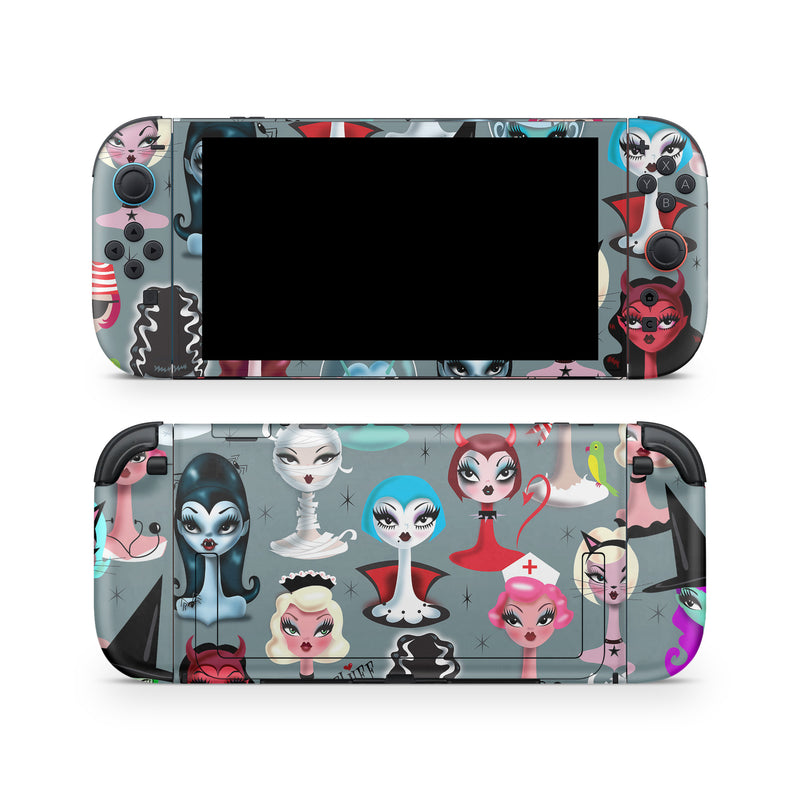 iStyles Nintendo Switch 2 Skin design of Facial expression, Head, Design, Collection, Fictional character, Pattern, Skull, Illustration, Collage, Style, with gray, white, red, blue, green, black, pink, purple colors, and tagged with people, fantasy, objects, costume, halloween, horror, pinup, pinupgirl.