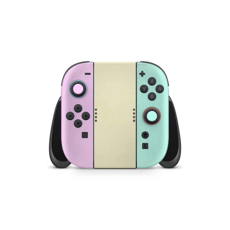 iStyles Nintendo Switch 2 Skin design, with pink, yellow, blue colors, and tagged with solidcolors, ice, cream, pastel.