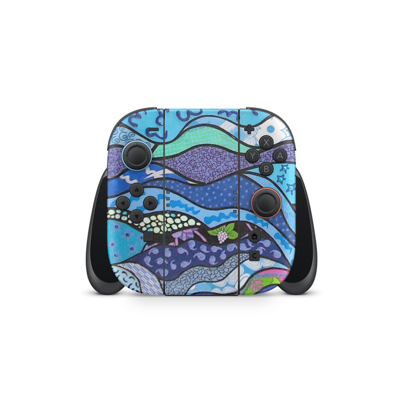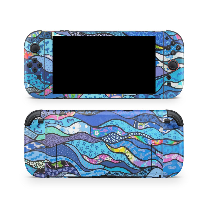 iStyles Nintendo Switch 2 Skin design of Blue, Pattern, Aqua, Water, Line, Design, Textile, Psychedelic art, Electric blue, with blue, black, gray, purple colors, and tagged with abstract, flowers.